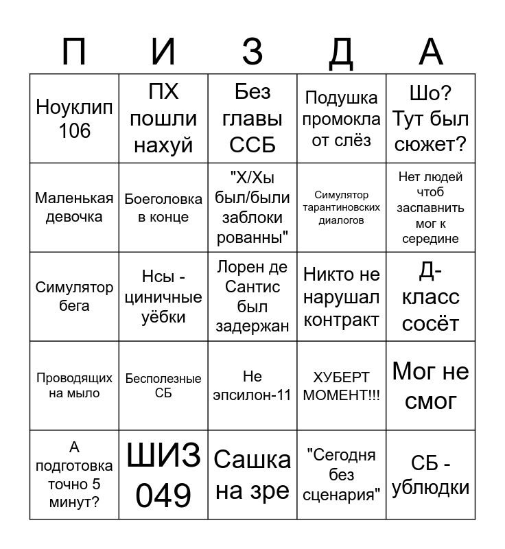 This bingo card has a free space and 24 words: Бесполезные СБ, ШИЗ 049, "X/Xы был/были заблоки рованны", А подготовка точно 5 минут?, Шо? Тут был сюжет?, Ноуклип 106, Маленькая девочка, ПХ пошли нахуй, Никто не нарушал контракт, Не эпсилон-11, Симулятор тарантиновских диалогов, Симулятор бега, ХУБЕРТ МОМЕНТ!!!, Мог не смог, Боеголовка в конце, "Сегодня без сценария", Д-класс сосёт, Без главы ССБ, Нет людей чтоб заспавнить мог к середине, Нсы - циничные уёбки, СБ - ублюдки, Проводящих на мыло, Подушка промокла от слёз and Сашка на зре.