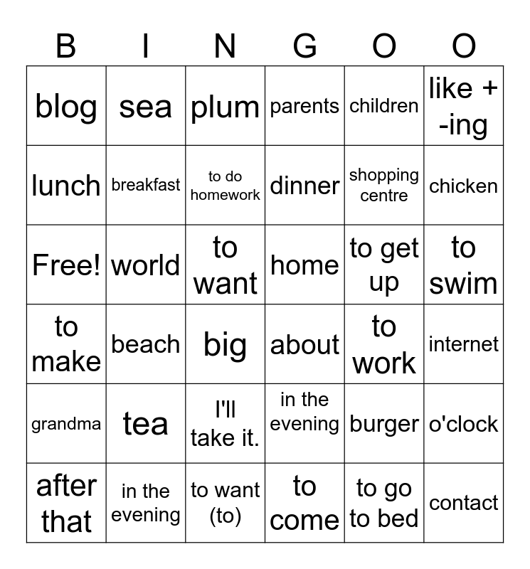 This bingo card has 36 words: in the evening, I'll take it., to come, lunch, to make, home, breakfast, to want (to), children, burger, chicken, parents, o'clock, world, dinner, blog, grandma, to get up, Free!, plum, to want, beach, about, big, to work, sea, shopping centre, in the evening, to do homework, like + -ing, contact, after that, internet, to swim, tea and to go to bed.