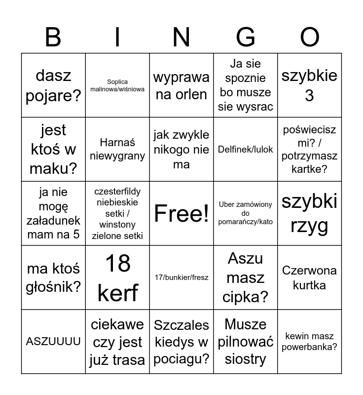 This bingo card has a free space and 24 words: 18 kerf, ciekawe czy jest już trasa, jak zwykle nikogo nie ma, ASZUUUU, szybkie 3, dasz pojare?, jest ktoś w maku?, Soplica malinowa/wiśniowa, Uber zamówiony do pomarańczy/kato, 17/bunkier/fresz, Delfinek/lulok, ja nie mogę załadunek mam na 5, Aszu masz cipka?, Czerwona kurtka, Harnaś niewygrany, Musze pilnować siostry, szybki rzyg, wyprawa na orlen, poświecisz mi? / potrzymasz kartke?, czesterfildy niebieskie setki / winstony zielone setki, kewin masz powerbanka?, ma ktoś głośnik?, Ja sie spoznie bo musze sie wysrac and Szczales kiedys w pociagu?.