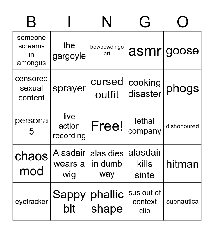 This bingo card has a free space and 24 words: Alasdair wears a wig, Sappy bit, cursed outfit, eyetracker, goose, someone screams in amongus, censored sexual content, the gargoyle, lethal company, alas dies in dumb way, cooking disaster, persona 5, alasdair kills sinte, hitman, sprayer, sus out of context clip, dishonoured, bewbewdingo art, phogs, live action recording, subnautica, chaos mod, asmr and phallic shape.
