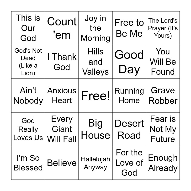 This bingo card has a free space and 35 words: Sadie Hawkins Dance, Chainsaw, East to West, I Thank God, Big House, Free to Be Me, God's Not Dead (Like a Lion), Speak Life, Hills and Valleys, My Story Your Glory, Ain't Nobody, The Lord's Prayer (It's Yours), I See Grace, Love Me Like I Am, This is Our God, Running Home, For the Love of God, Anxious Heart, God Really Loves Us, Enough Already, Desert Road, I'm So Blessed, Fear is Not My Future, Believe, Joy in the Morning, You Will Be Found, If the Lord Builds the House, Jesus Can, Good Day, Grave Robber, Strong, Hallelujah Anyway, Every Giant Will Fall, Count 'em and Jireh.