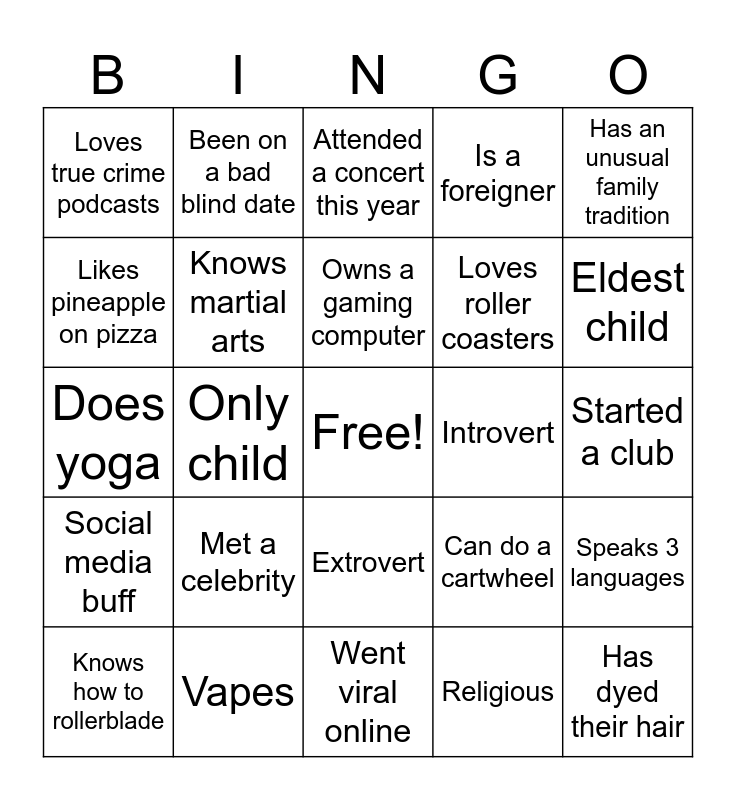 This bingo card has a free space and 25 words: Met a celebrity, Went viral online, Owns a gaming computer, Knows how to rollerblade, Has an unusual family tradition, Loves true crime podcasts, Likes pineapple on pizza, Been on a bad blind date, Introvert, Extrovert, Loves roller coasters, Does yoga, Can do a cartwheel, Speaks 3 languages, Knows martial arts, Goes to the gym, Started a club, Attended a concert this year, Eldest child, Only child, Has dyed their hair, Vapes, Social media buff, Is a foreigner and Religious.