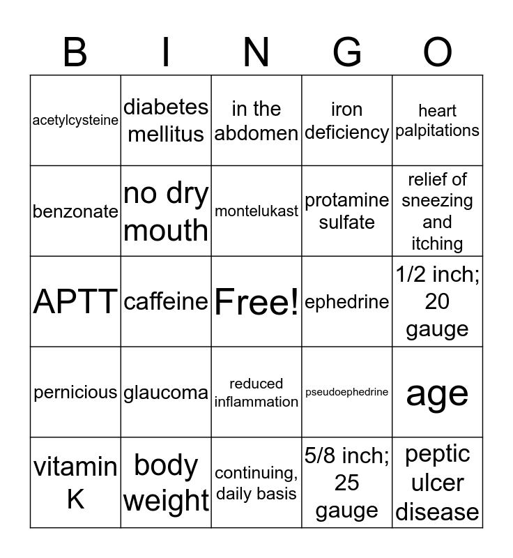 This bingo card has a free space and 24 words: glaucoma, body weight, montelukast, vitamin K, heart palpitations, acetylcysteine, benzonate, diabetes mellitus, ephedrine, reduced inflammation, protamine sulfate, APTT, pseudoephedrine, age, no dry mouth, 5/8 inch; 25 gauge, 1/2 inch; 20 gauge, in the abdomen, relief of sneezing and itching, caffeine, peptic ulcer disease, pernicious, iron deficiency and continuing, daily basis.