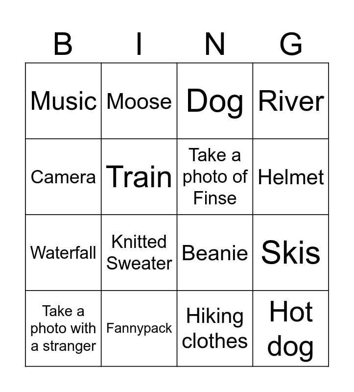 This bingo card has 16 words: Take a photo with a stranger, Fannypack, Dog, River, Camera, Moose, Beanie, Skis, Music, Train, Hiking clothes, Helmet, Waterfall, Knitted Sweater, Take a photo of Finse and Hot dog.