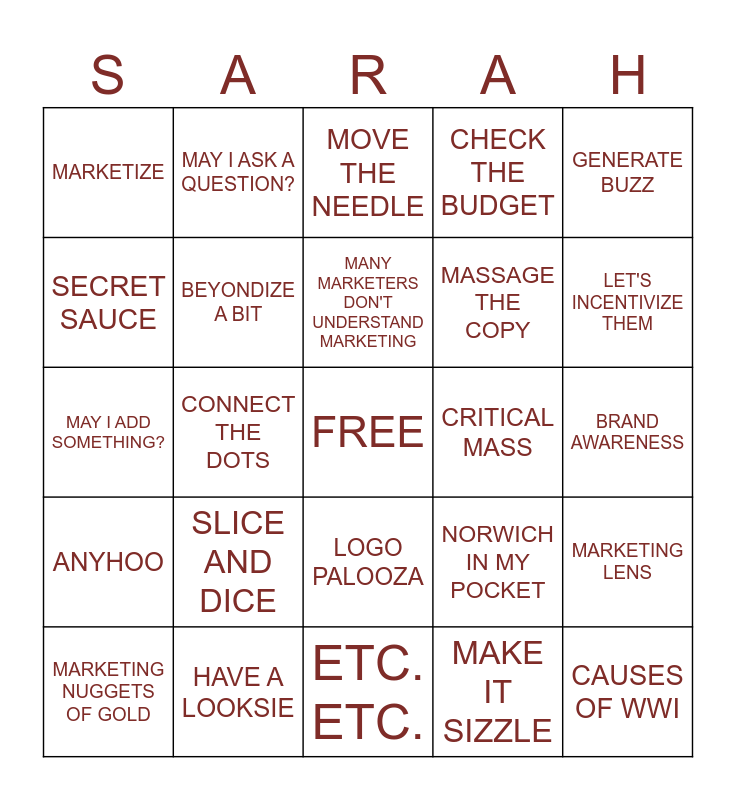 This bingo card has a free space and 29 words: MARKETING NUGGETS OF GOLD, CROSS POLINATION, CONNECT THE DOTS, MARKETERS DREAM, MARKETIZE, MOVE THE NEEDLE, BEYONDIZE A BIT, SLICE AND DICE, CRITICAL MASS, HAVE A LOOKSIE, BRAND AWARENESS, CAUSES OF WWI, ETC. ETC., MAKE IT SIZZLE, LET'S INCENTIVIZE THEM, JUICE WORTH THE SQUEEZE, LOGO PALOOZA, ANYHOO, GENERATE BUZZ, MAY I ADD SOMETHING?, NORWICH IN MY POCKET, LOW HANGING FRUIT, MASSAGE THE COPY, SECRET SAUCE, CHECK THE BUDGET, MAY I ASK A QUESTION?, MARKETING LENS, MANY MARKETERS DON'T UNDERSTAND MARKETING and CPGize IT.