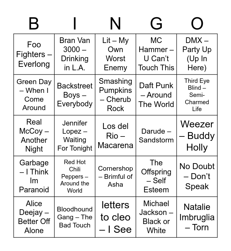 This bingo card has 76 words: Free!, Ace of Base – Don’t Turn Around, Backstreet Boys – Everybody, Captain Jack – Captain Jack, Crazy Town – Butterfly, Depeche Mode – Enjoy the Silence, Fly – Sugar Ray, Haddaway – What Is Love, letters to cleo – I See, Marky Mark And The Funky Bunch – Good Vibrations, Natalie Imbruglia – Torn, Oasis – Wonderwall, Red Hot Chili Peppers – Around the World, Smashing Pumpkins – Cherub Rock, Tal Bachman – She’s So High, Third Eye Blind – Semi-Charmed Life, Ace of Base – The Sign, Bloodhound Gang – The Bad Touch, Cher – Believe, Daft Punk – Around The World, Depeche Mode – Policy of Truth, Foo Fighters – Everlong, Jennifer Lopez – Waiting For Tonight, Lit – My Own Worst Enemy, MC Hammer – U Can’t Touch This, New Kids On the Block – Step By Step, Our Lady Peace – Clumsy, Red Hot Chili Peppers – Californication, Snap! – Rhythm Is a Dancer, The Chemical Brothers – Let Forever Be, TLC – No Scrubs, Alanis Morissette – You Oughta Know, Blur – Song 2, Cornershop – Brimful of Asha, Darude – Sandstorm, DMX – Party Up (Up In Here), Fun Factory – Close To You, Kris Kross – Jump, Los del Rio – Macarena, Michael Jackson – Black or White, New Radicals – You Get What You Give, R.E.M. – Losing My Religion, Robbie Williams – Millennium, Soundgarden – Black Hole Sun, The Cranberries – Dreams, Toni Braxton – He Wasn’t Man Enough, Alice Deejay – Better Off Alone, Bran Van 3000 – Drinking in L.A., Corona – Rhythm of the Night, David Bowie – Im Afraid Of Americans, Duran Duran – Come Undone, Garbage – I Think Im Paranoid, Len – Steal My Sunshine, Madison Avenue – Don’t Call Me Baby, Mr. President – Coco Jambo, Nirvana – Smells Like Teen Spirit, Rammstein – Du hast, Shania Twain – Man! I Feel Like A Woman, Spice Girls – Wannabe, The Offspring – Come Out and Play, Weezer – Buddy Holly, Aqua – Barbie Girl, C+C Music Factory – Gonna Make You Sweat, Counting Crows – Mr. Jones, Deee-Lite – Groove Is In The Heart, Filter – Take a Picture, Green Day – When I Come Around, Lenny Kravitz – Fly Away, Madonna – Vogue, N-Trance – Stayin Alive (feat. Ricardo Da Force), No Doubt – Don’t Speak, Real McCoy – Another Night, Sir Mix-A-Lot – Baby got back, Sublime – What I Got, The Offspring – Self Esteem and Whitney Houston – I’m Every Woman.