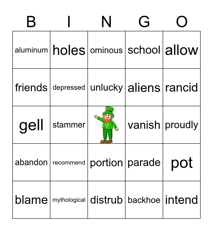 This bingo card has a free space and 29 words: blame, gaze, stammer, polution, aluminum, ominous, depressed, recommend, vanish, mythological, proudly, intend, distrub, backhoe, rancid, reflect, portion, abandon, allow, gell, parade, Leprechaun, aliens, friends, school, holes, pot, unlucky and gold.