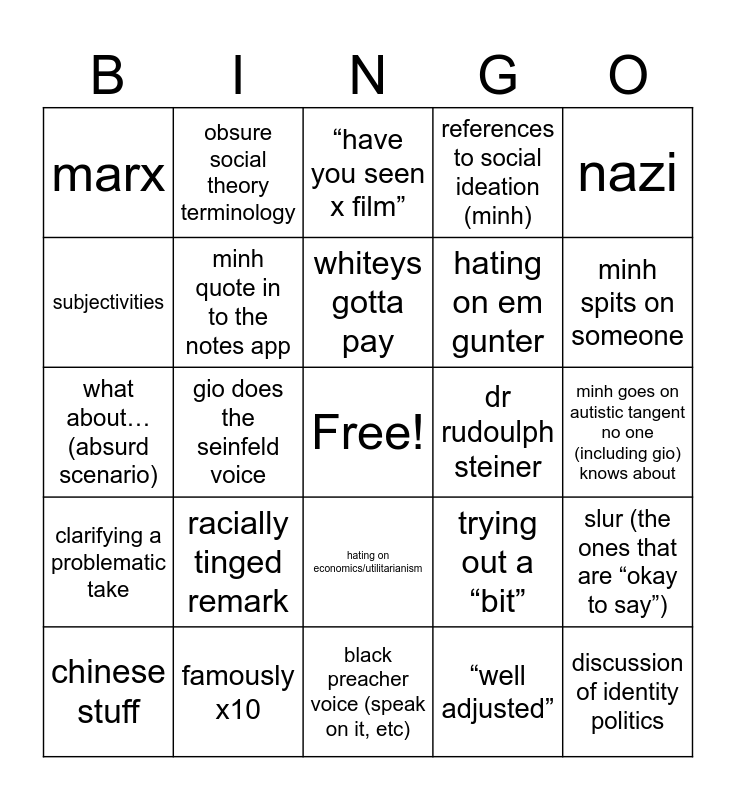 This bingo card has a free space and 24 words: racially tinged remark, famously x10, whiteys gotta pay, chinese stuff, nazi, marx, subjectivities, obsure social theory terminology, dr rudoulph steiner, hating on economics/utilitarianism, hating on em gunter, what about… (absurd scenario), trying out a “bit”, slur (the ones that are “okay to say”), minh quote in to the notes app, “well adjusted”, minh goes on autistic tangent no one (including gio) knows about, “have you seen x film”, minh spits on someone, gio does the seinfeld voice, discussion of identity politics, clarifying a problematic take, references to social ideation (minh) and black preacher voice (speak on it, etc).
