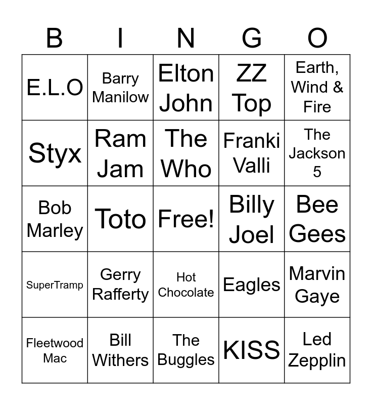 This bingo card has a free space and 29 words: Fleetwood Mac, Lynyrd Skynrd, Toto, The Police, E.L.O, Elton John, Ram Jam, Gerry Rafferty, Billy Joel, Bill Withers, Bee Gees, Led Zepplin, The Buggles, KISS, The Jackson 5, Dolly Parton, Hot Chocolate, SuperTramp, Earth, Wind & Fire, Bob Marley, Eagles, Cheap Trick, Franki Valli, Styx, ZZ Top, Barry Manilow, Marvin Gaye, The Who and T.Rex.