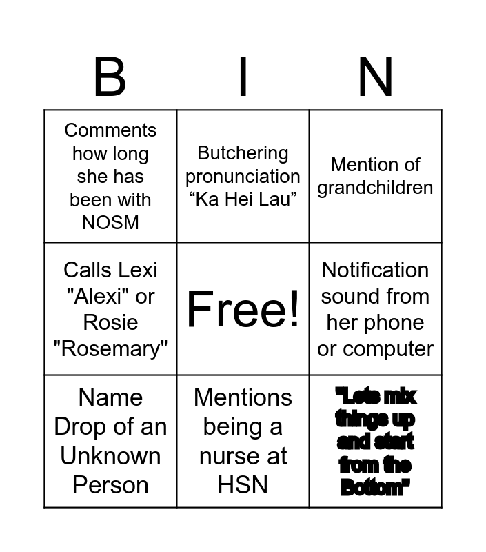 This bingo card has a free space and 8 words: Notification sound from her phone or computer, Mention of grandchildren, Butchering pronunciation “Ka Hei Lau”, Name Drop of an Unknown Person, Comments how long she has been with NOSM, "Lets mix things up and start from the Bottom", Calls Lexi "Alexi" or Rosie "Rosemary" and Mentions being a nurse at HSN.