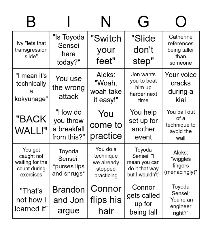 This bingo card has a free space and 24 words: Toyoda Sensei: *purses lips and shrugs*, Brandon and Jon argue, Aleks: "Woah, woah take it easy!", "That's not how I learned it", Catherine references being taller than someone, Ivy "lets that transgression slide", "I mean it's technically a kokyunage", "Is Toyoda Sensei here today?", You help set up for another event, You do a technique we already stopped practicing, Jon wants you to beat him up harder next time, "BACK WALL!", Toyoda Sensei: "I mean you can do it that way but I wouldn't", Aleks: *wiggles fingers (menacingly)*, You use the wrong attack, Connor gets called up for being tall, You bail out of a technique to avoid the wall, "Switch your feet", Your voice cracks during a kiai, "How do you throw a breakfall from this?", Toyoda Sensei: "You're an engineer right?", You get caught not waiting for the count during exercises, "Slide don't step" and Connor flips his hair.