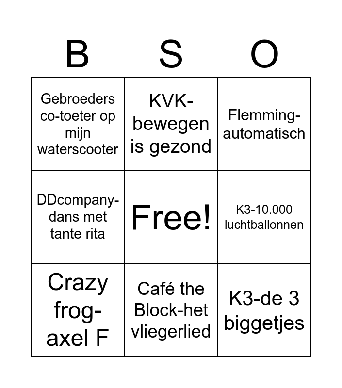 This bingo card has a free space and 8 words: K3-10.000 luchtballonnen, Flemming-automatisch, KVK-bewegen is gezond, Crazy frog-axel F, Gebroeders co-toeter op mijn waterscooter, K3-de 3 biggetjes, DDcompany-dans met tante rita and Café the Block-het vliegerlied.