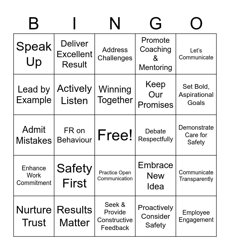 This bingo card has a free space and 24 words: Safety First, Results Matter, Winning Together, Nurture Trust, Let’s Communicate, Speak Up, Lead by Example, Deliver Excellent Result, Debate Respectfully, Practice Open Communication, Keep Our Promises, Admit Mistakes, Embrace New Idea, Communicate Transparently, Actively Listen, Proactively Consider Safety, Demonstrate Care for Safety, Address Challenges, Set Bold, Aspirational Goals, FR on Behaviour, Employee Engagement, Enhance Work Commitment, Promote Coaching & Mentoring and Seek & Provide Constructive Feedback.