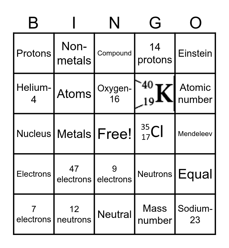 This bingo card has 2 images, a free space and 27 words: 7 electrons, Conducts electricity, Metals, 10 neutrons, Protons, Compound, Atoms, 47 electrons, 12 neutrons, Mendeleev, Sodium-23, Neutral, Mass number, Atomic number, Dull, 9 electrons, Electrons, Einstein, Nucleus, Neutrons, Negative, Helium-4, 14 protons, Non-metals, Equal, Oxygen-16 and Positive.