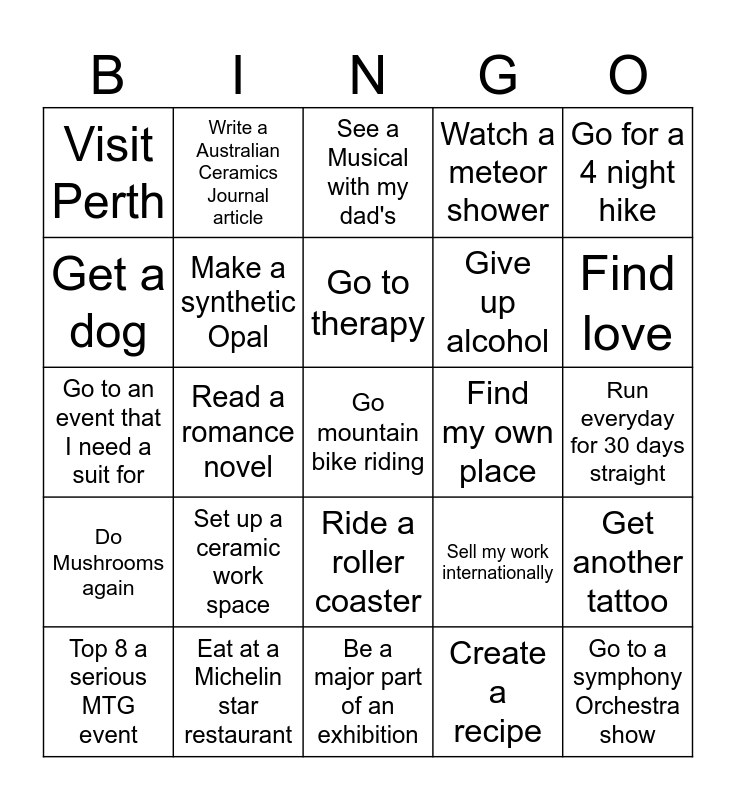 This bingo card has 25 words: Set up a ceramic work space, Be a major part of an exhibition, Go to therapy, Top 8 a serious MTG event, Go for a 4 night hike, Visit Perth, Get a dog, Write a Australian Ceramics Journal article, Find my own place, Ride a roller coaster, Give up alcohol, Go to an event that I need a suit for, Sell my work internationally, Get another tattoo, Make a synthetic Opal, Go to a symphony Orchestra show, Run everyday for 30 days straight, See a Musical with my dad's, Find love, Read a romance novel, Go mountain bike riding, Eat at a Michelin star restaurant, Do Mushrooms again, Watch a meteor shower and Create a recipe.
