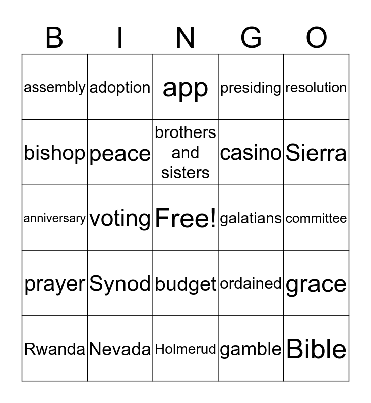 This bingo card has a free space and 24 words: Synod, Nevada, brothers and sisters, Rwanda, resolution, assembly, bishop, adoption, galatians, budget, casino, anniversary, ordained, grace, peace, gamble, committee, app, Sierra, voting, Bible, prayer, presiding and Holmerud.