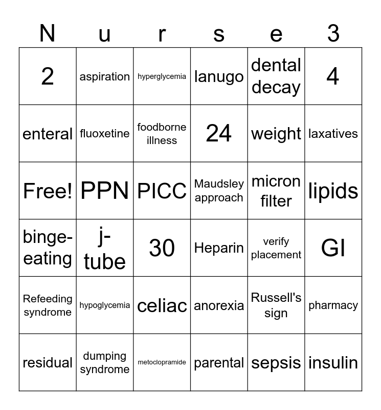 This bingo card has 36 words: anorexia, celiac, parental, enteral, binge-eating, Maudsley approach, fluoxetine, metoclopramide, dental decay, Russell's sign, laxatives, lanugo, pharmacy, PPN, 24, 2, Refeeding syndrome, micron filter, Free!, hyperglycemia, PICC, j-tube, Heparin, 30, verify placement, aspiration, weight, dumping syndrome, foodborne illness, 4, insulin, residual, GI, lipids, hypoglycemia and sepsis.