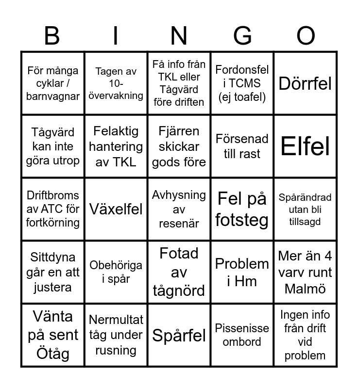 This bingo card has 25 words: Obehöriga i spår, Spårfel, Fjärren skickar gods före, Vänta på sent Ötåg, Dörrfel, För många cyklar / barnvagnar, Tågvärd kan inte göra utrop, Tagen av 10-övervakning, Fel på fotsteg, Fotad av tågnörd, Försenad till rast, Driftbroms av ATC för fortkörning, Problem i Hm, Mer än 4 varv runt Malmö, Felaktig hantering av TKL, Ingen info från drift vid problem, Spårändrad utan bli tillsagd, Få info från TKL eller Tågvärd före driften, Elfel, Växelfel, Avhysning av resenär, Nermultat tåg under rusning, Sittdyna går en att justera, Fordonsfel i TCMS (ej toafel) and Pissenisse ombord.