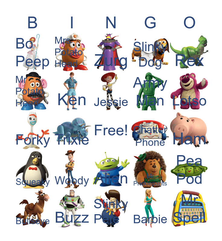 This bingo card has 24 images, a free space and 24 words: Woody, Buzz, Jessie, Bullseye, Rex, Bo Peep, Mr Potato Head, Mrs Potato Head, Chatter Phone, Alien, Army Man, Forky, Mr Pricklepants, Pea Pod, Ken, Barbie, Ham, Zurg, Lotso, Trixie, Mr Spell, Squeaky, Slinky Dog and Stinky Pete.