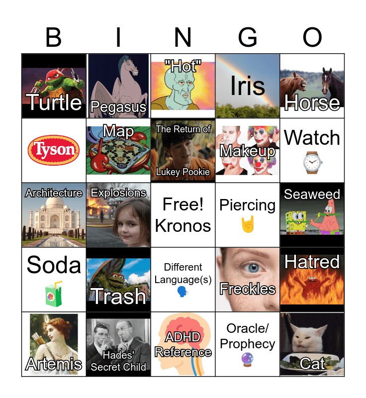 This bingo card has 19 images, a free space and 23 words: Trash, Hades' Secret Child, The Return of Lukey Pookie, Artemis, Horse, Turtle, Pegasus, Piercing 🤘, Different Language(s) 🗣, Makeup, Architecture, Freckles, Hatred, Map, Oracle/ Prophecy 🔮, Seaweed, "Hot", Watch ⌚, Explosions, Cat, Soda 🧃, Iris and ADHD Reference.