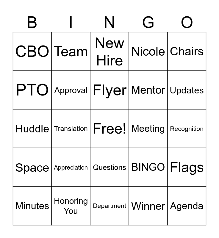This bingo card has a free space and 29 words: Minutes, Birthday, Translation, Hours, CBO, New Hire, Approval, Appreciation, Meeting, Honoring You, Recognition, Agenda, Department, Winner, Updates, Flexing, Questions, Space, Chairs, Huddle, BINGO, Scavenger, Mentor, PTO, Nicole, Team, Flags, Flyer and email.