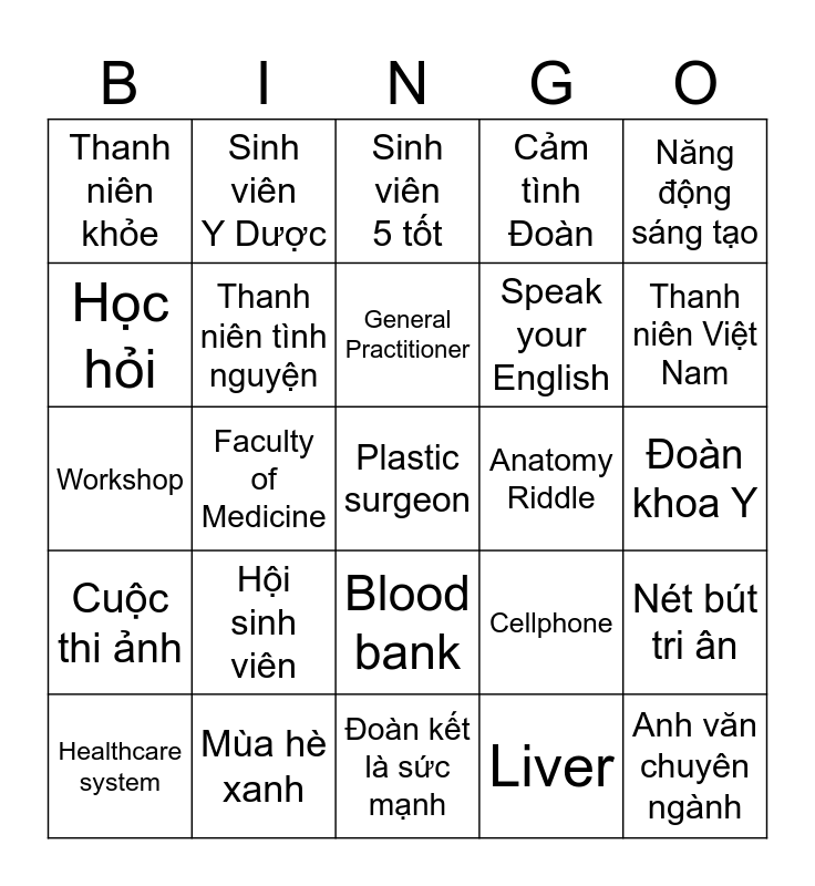 This bingo card has 25 words: Cuộc thi ảnh, Mùa hè xanh, Plastic surgeon, Liver, Năng động sáng tạo, Thanh niên khỏe, Sinh viên Y Dược, Sinh viên 5 tốt, Anatomy Riddle, Nét bút tri ân, Học hỏi, Thanh niên tình nguyện, Đoàn kết là sức mạnh, Cellphone, Thanh niên Việt Nam, Healthcare system, Faculty of Medicine, General Practitioner, Speak your English, Đoàn khoa Y, Workshop, Hội sinh viên, Blood bank, Cảm tình Đoàn and Anh văn chuyên ngành.