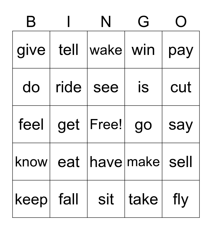 This bingo card has a free space and 24 words: eat, fall, see, keep, pay, give, do, tell, go, have, is, feel, make, sell, ride, take, say, wake, cut, get, fly, know, win and sit.