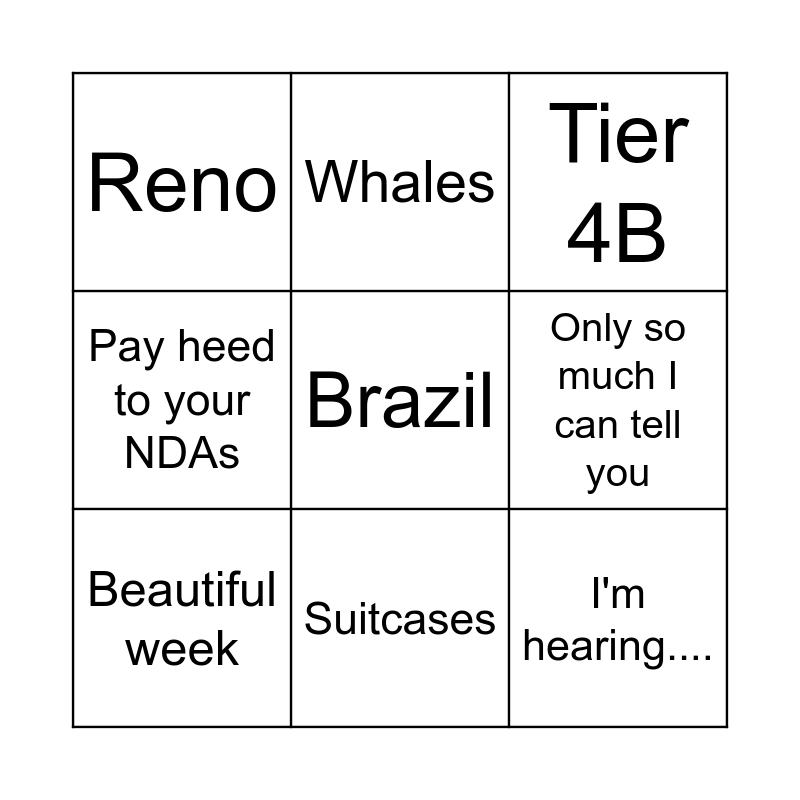 This bingo card has 9 words: Beautiful week, Tier 4B, Whales, Pay heed to your NDAs, Reno, Only so much I can tell you, Brazil, I'm hearing.... and Suitcases.