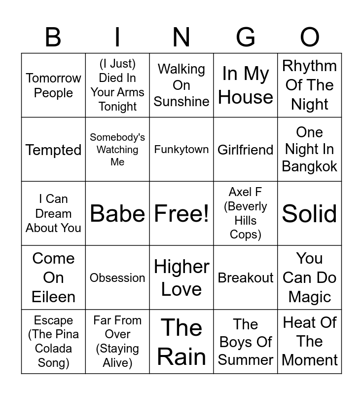 This bingo card has a free space and 34 words: Tainted Love, The Boys Of Summer, Don't Worry Be Happy, Dance Hall Days, Come On Eileen, Somebody's Watching Me, Rhythm Of The Night, Escape (The Pina Colada Song), (I Just) Died In Your Arms Tonight, Word Up, Funkytown, Walking On Sunshine, I Think We're Alone Now, Let's Go All The Way, Axel F (Beverly Hills Cops), One Night In Bangkok, Far From Over (Staying Alive), I Can Dream About You, Obsession, Breakout, Higher Love, Don't Stop The Music, Tomorrow People, Solid, The Rain, Heat Of The Moment, In My House, Sunglasses At Night, Girlfriend, Tempted, Suddenly Last Summer, Babe, You Can Do Magic and Someday.