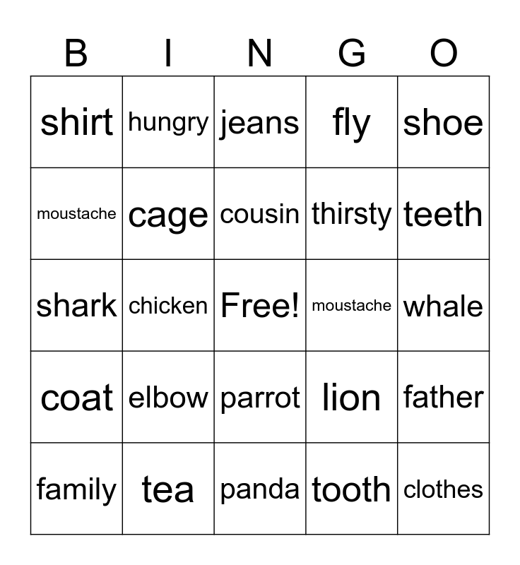 This bingo card has a free space and 97 words: animal, bear, bird, chicken, cow, dog, donkey, face, foot, feet, hair, hand, head, coat, pants, shirt, shoe, shorts, skirt, sock, wear, white, yellow, children, classmate, cousin, family, father, friend, girl, cage, fly, kitten, lion, panda, parrot, penguin, puppy, rabbit, shark, snail, whale, neck, tooth, elbow, finger, aunt, grown-up, parent, scarf, uncle, bottle, bowl, cheese, coffee, cup, glass, hungry, milk, shake, noodles, pancake, pasta, picnic, plate, salad, sandwich, sauce, soup, tea, thirsty, vegetable, crocodile, horse, lizard, monkey, polar bear, jellyfish, moustache, shoulder, stomach, teeth, helmet, swimsuit, baseball cap, boots, clothes, glasses, handbag, jacket, jeans, dolphin, kangaroo, lion, moustache, sandwich and vegetable.