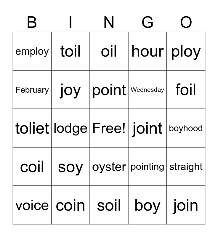 This bingo card has a free space and 34 words: boycott, boy, boil, choice, coil, joy, ploy, voice, toil, spoil, point, oil, moist, noise, joint, foil, coin, toliet, soy, pointing, oyster, enjoy, employ, boyhood, soil, join, hour, Monday, Wednesday, February, cage, lodge, straight and frighten.