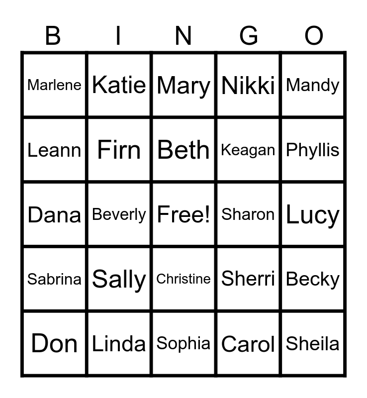 This bingo card has a free space and 29 words: Don, Wauneta, Beverly, Janet, Marlene, Mary, Firn, Sally, Sharon, Linda, Lucy, Sheila, Sophia, Carol, Phyllis, Eva, Christine, Sabrina, Mandy, Dana, Sherri, Jeff, Keagan, Leann, Nikki, Katie, Becky, Beth and Scott.
