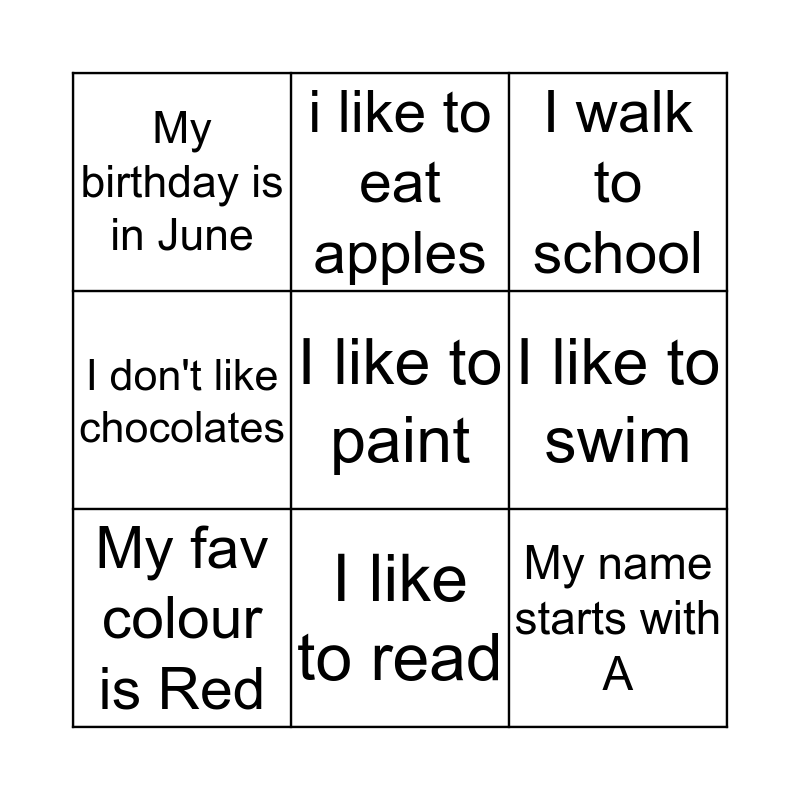 This bingo card has a free space and 8 words: I like to swim, I walk to school, i like to eat apples, My fav colour is Red, My birthday is in June, My name starts with A, I don't like chocolates and I like to read.