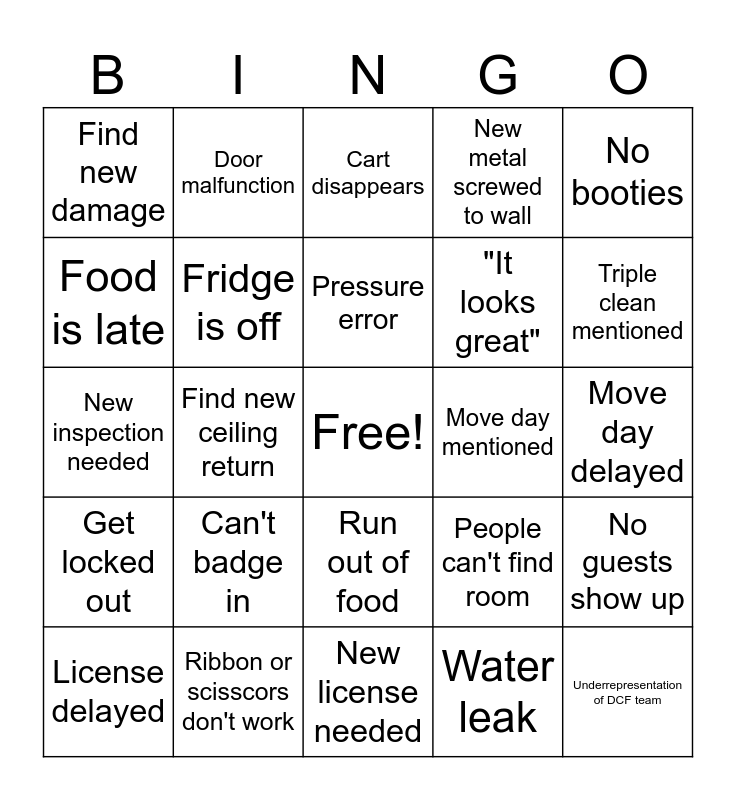 This bingo card has a free space and 24 words: Can't badge in, Ribbon or scisscors don't work, Pressure error, License delayed, No booties, Find new damage, Food is late, Door malfunction, Move day mentioned, Run out of food, "It looks great", New inspection needed, People can't find room, No guests show up, Fridge is off, Water leak, Move day delayed, Cart disappears, Triple clean mentioned, Find new ceiling return, Underrepresentation of DCF team, Get locked out, New metal screwed to wall and New license needed.