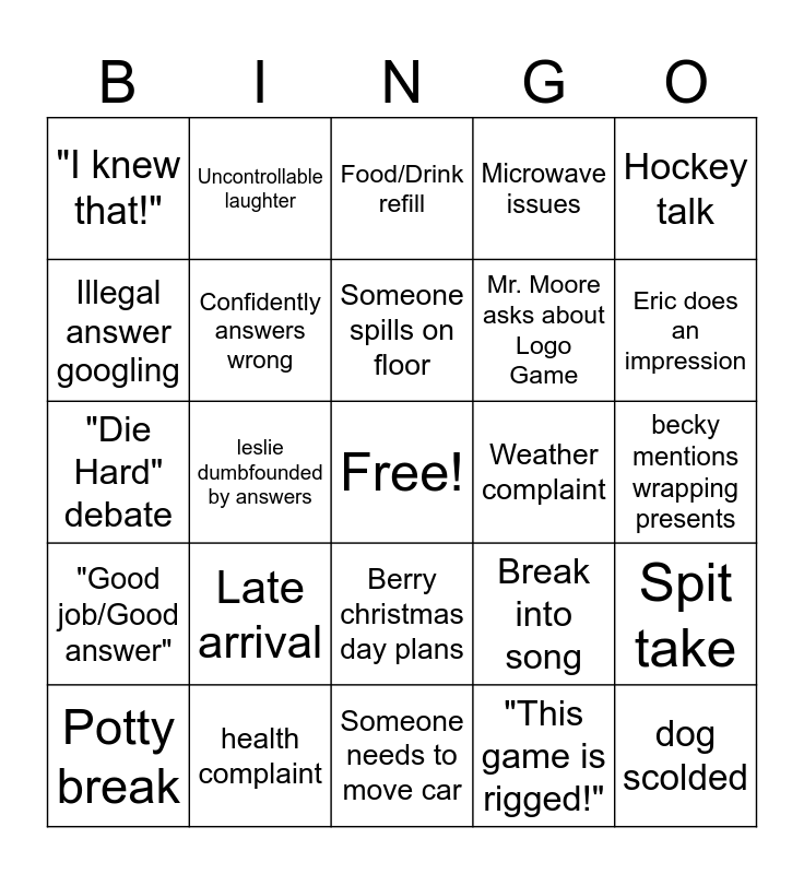 This bingo card has a free space and 29 words: Potty break, power point problems, leslie dumbfounded by answers, Amelia hand-off, "I knew that!", Food/Drink refill, Confidently answers wrong, Late arrival, Weather complaint, health complaint, becky mentions wrapping presents, dog scolded, Someone needs to move car, "This game is rigged!", Eric does an impression, Christmas tree story, Berry christmas day plans, "Good job/Good answer", Hockey talk, "Die Hard" debate, Break into song, Jessie's reading, Mr. Moore asks about Logo Game, Illegal answer googling, Microwave issues, Uncontrollable laughter, Spit take, Someone spills on floor and Cell phone distraction.