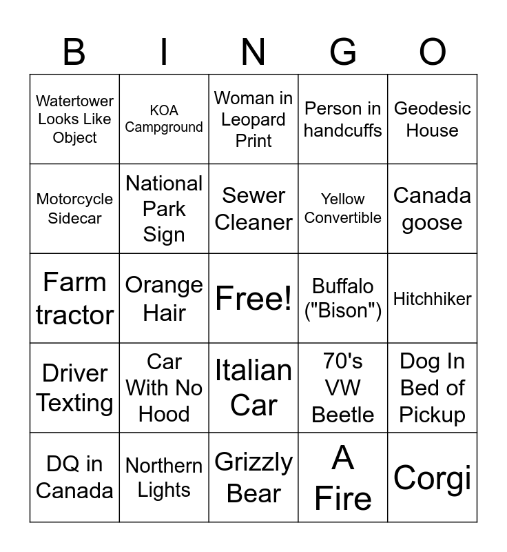 This bingo card has a free space and 68 words: MAGA hat, Corgi, White wall tires, Black Squirrel, Hockey Rink, Tim Hortons, KOA Campground, Waterfall, Sewer Cleaner, TV Truck, Italian Car, Smashed Barrel, Hitchhiker, Geodesic House, Ferris Wheel, Motorcycle Sidecar, Orange Hair, Watertower Looks Like Object, Rainbow T-Shirt, Car With No Hood, Yellow Convertible, 70's VW Beetle, Driver Texting, Cheese Factory, Dead Deer, Snow Mobile Crossing, Confederate Flag, Trump 2024 On A Barn, Dog In Bed of Pickup, Crying Child, Woman in Leopard Print, DHL Truck, Wicked Mullet, Person with feet out window, Person in handcuffs, Windmill, Silver grain bin, DQ in Canada, Canada goose, Farm tractor, Amazon truck, Moving Train, National Park Sign, Casino, Motorcycle Gang +10, Barn Quilt, Something called "Trading Post", Indian crafts/gift store, Buffalo ("Bison"), Northern Lights, VW Campervan/bus, NW Territory license plate, Teepee, Grizzly Bear, Seaplane/bush plane, Worlds' largest roadside attraction, A Fire, Flat Tire, Airport (Not ANC), Dog with big ears, Person riding a horse, Herd of buffalo (bison?), Mountain goat, Canadian speaking French, Restaurant/hotel with a fish tank, Hotel with a taxidermy moose or bear, Group of kayakers and Pickup with a flag in the truck bed.