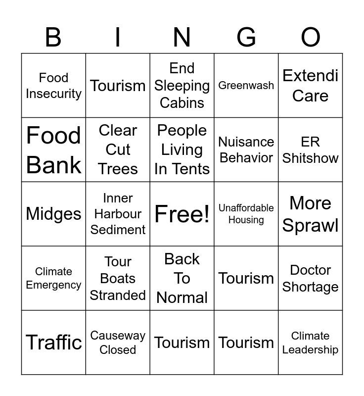 This bingo card has a free space and 24 words: Tour Boats Stranded, Causeway Closed, People Living In Tents, Traffic, Extendi Care, Food Insecurity, Food Bank, Tourism, Unaffordable Housing, Back To Normal, Nuisance Behavior, Midges, Tourism, Doctor Shortage, Clear Cut Trees, Tourism, More Sprawl, End Sleeping Cabins, ER Shitshow, Inner Harbour Sediment, Climate Leadership, Climate Emergency, Greenwash and Tourism.