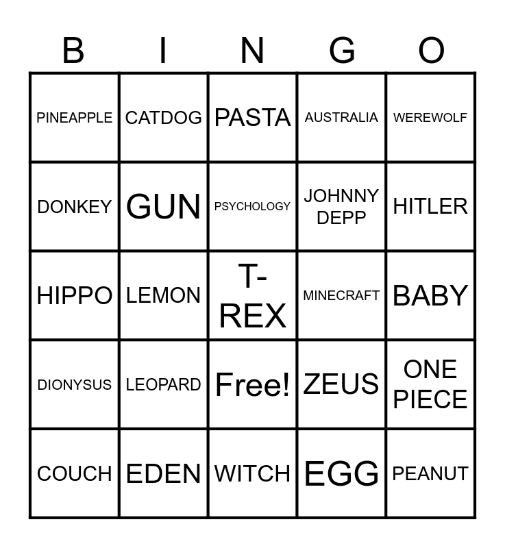 This bingo card has 26 words: Free!, EGG, PSYCHOLOGY, EDEN, WEREWOLF, PINEAPPLE, DONKEY, CATDOG, BABY, ZEUS, JOHNNY DEPP, HIPPO, ONE PIECE, COUCH, LEMON, TROMBONE, AUSTRALIA, DIONYSUS, PASTA, T-REX, HITLER, WITCH, MINECRAFT, LEOPARD, GUN and PEANUT.