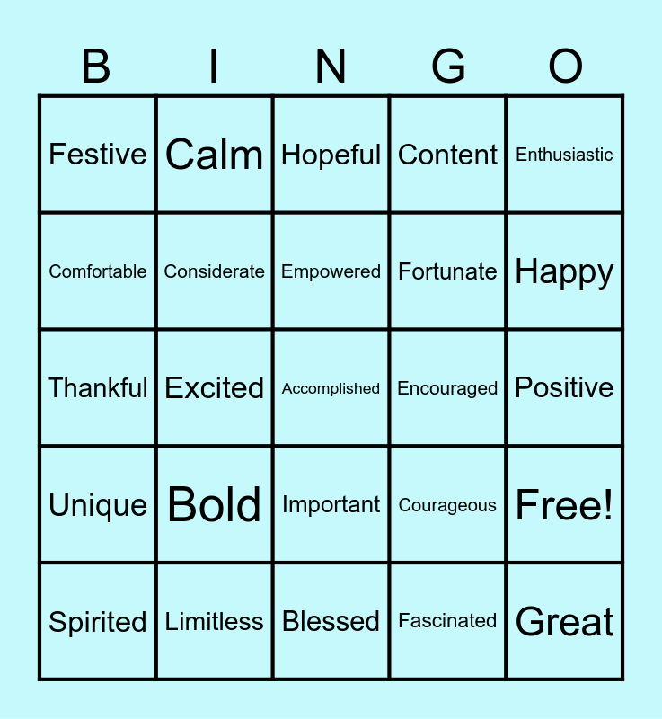 This bingo card has 50 words: Accepting, Accomplished, Affectionate, Blessed, Bold, Brave, Calm, Cheerful, Comfortable, Confident, Considerate, Content, Free!, Courageous, Determined, Devoted, Empowered, Encouraged, Energetic, Enthusiastic, Excited, Fascinated, Festive, Fortunate, Glad, Great, Happy, Healthy, Hopeful, Important, Inspired, Intrigued, Joyous, Kind, Limitless, Loved, Optimistic, Passionate, Peaceful, Positive, Powerful, Relaxed, Satisfied, Serene, Spirited, Thankful, Thrilled, Understanding, Unique and Wonderful.