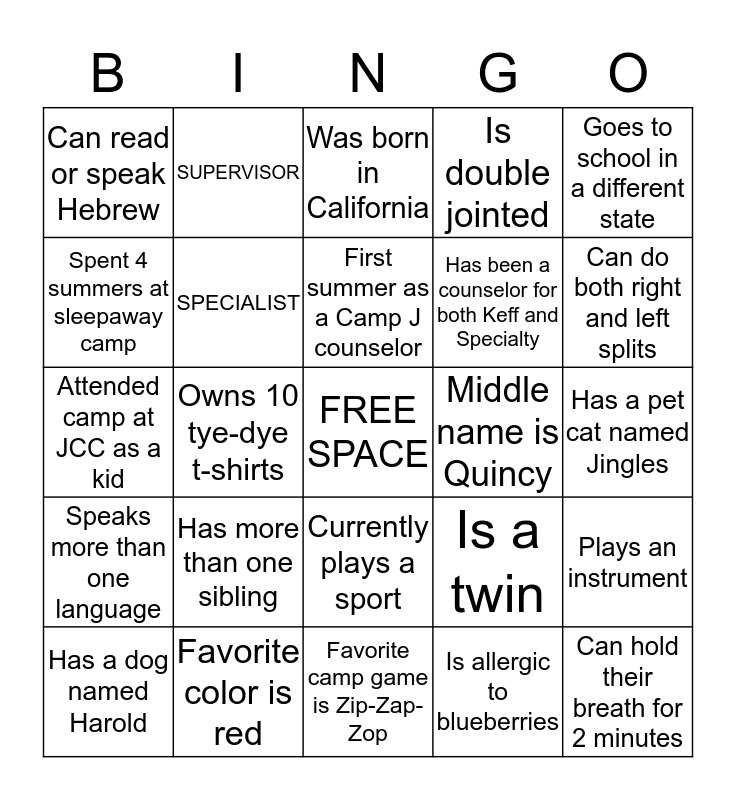This bingo card has a free space and 24 words: Has more than one sibling, Favorite color is red, First summer as a Camp J counselor, Has a dog named Harold, Goes to school in a different state, Can read or speak Hebrew, Spent 4 summers at sleepaway camp, SUPERVISOR, Middle name is Quincy, Currently plays a sport, Has been a counselor for both Keff and Specialty, Attended camp at JCC as a kid, Is a twin, Plays an instrument, SPECIALIST, Is allergic to blueberries, Has a pet cat named Jingles, Was born in California, Can do both right and left splits, Owns 10 tye-dye t-shirts, Can hold their breath for 2 minutes, Speaks more than one language, Is double jointed and Favorite camp game is Zip-Zap-Zop.