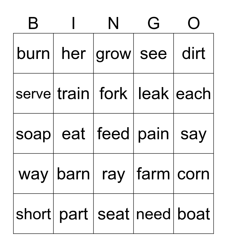 This bingo card has a free space and 24 words: barn, part, fork, short, dirt, burn, serve, her, pain, ray, leak, soap, farm, corn, train, need, say, grow, each, eat, boat, way, see and seat.