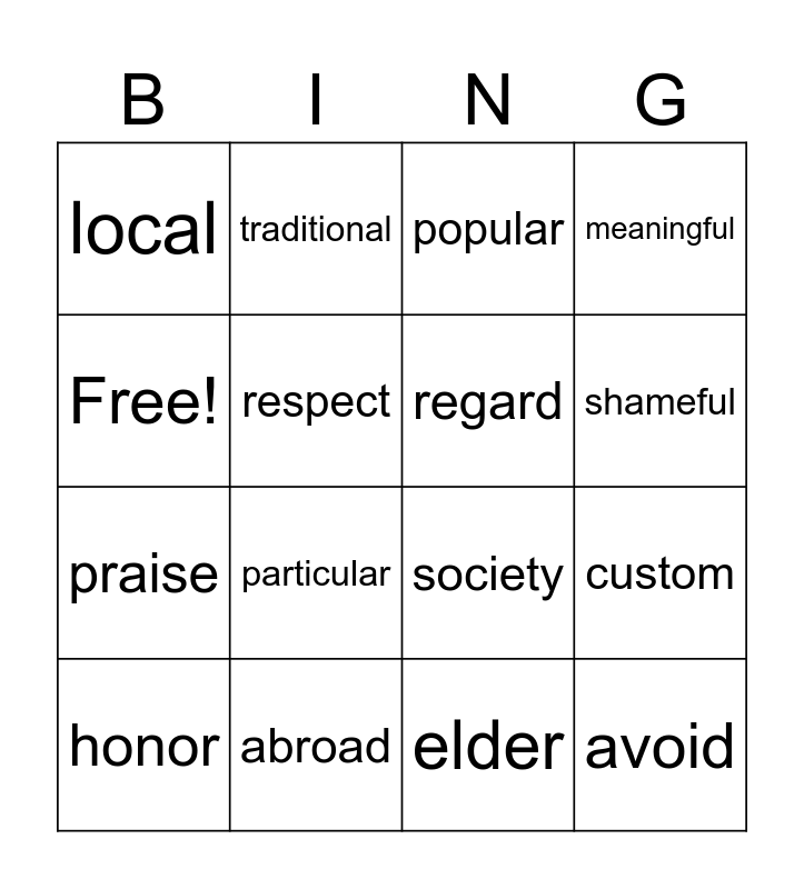 This bingo card has 16 words: abroad, custom, popular, local, praise, traditional, society, elder, Free!, respect, honor, meaningful, particular, shameful, regard and avoid.