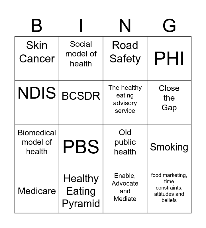 This bingo card has 16 words: Healthy Eating Pyramid, Smoking, Road Safety, Skin Cancer, Biomedical model of health, Social model of health, Old public health, Enable, Advocate and Mediate, NDIS, BCSDR, Medicare, PHI, PBS, Close the Gap, The healthy eating advisory service and food marketing, time constraints, attitudes and beliefs.