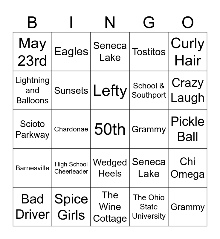 This bingo card has a free space and 29 words: Bad Driver, Fairy Garden, Chardonae, Bird Nerd, May 23rd, Seneca Lake, Sunsets, High School Cheerleader, Grammy, Spice Girls, Pickle Ball, Grammy, The Wine Cottage, The Ohio State University, Crazy Laugh, Speech Therapist, Wedged Heels, Barnesville, Curly Hair, Scioto Parkway, Seneca Lake, Vanessa and Lily, School & Southport, Lightning and Balloons, Tostitos, Eagles, Chi Omega, Lefty and John.