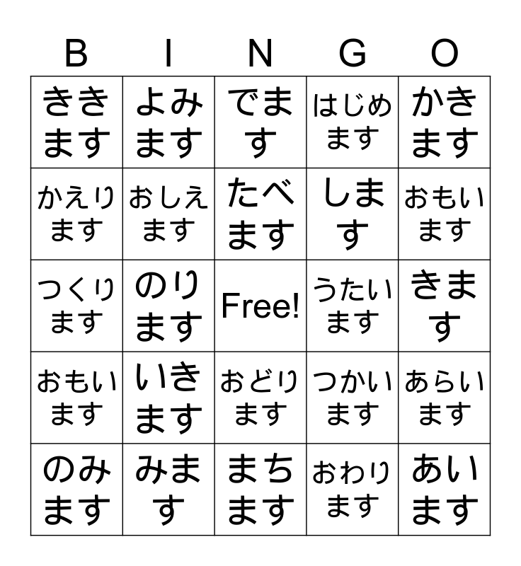 This bingo card has a free space and 24 words: いきます, みます, たべます, のみます, かきます, ききます, かえります, よみます, うたいます, おどります, します, つくります, つかいます, あらいます, おしえます, おわります, きます, でます, おもいます, のります, あいます, おもいます, はじめます and まちます.
