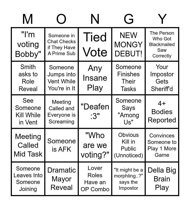 This bingo card has a free space and 115 words: FEEB, Failed Double Kill, Incredible Game Ending, Role Reveal into Instant Death, Swapper “Woooooah”, Same Role Twice in a row, NEW MONGY DEBUT!, Outrage in dead chat, Role Guess Shot in the Dark, Lovers Win!, Impostor Kills Other Impostors Lover, "Why did you walk away from the body", SUBMERGED!, Greatly Deserved Impostor Win, Undeserved Impostor Win, Kill on Cams, "Who are we voting?", Map Switch, Smith Role Reveals, Someone DCs, Someone Leaves Into Someone Joining, Tied Vote, Your Streamer Dies Round 1, "Stop killing ______", Optimal Swapper Play, Meeting Called Mid Task, Dramatic Mayor Reveal, Fake Role reveal, Jester Win, Executioner Win, Your Impostor Gets Sheriff'd, Any Insane Play, Meeting Called and Everyone is Screaming, Meta Play, Swapper Jester Win, "I Didn't See You?!", "I'm Down to Skip", "It Wasn't Me!" (it was), Everyone is Annoyed By 1 Role, Pikmin 5 Locks the FUCK in, Lobby Reset, 3rd Impostor Moment, Impostor w/ Giant Modifier, Your Executioner Gets Killed, "It Might be a Swooper" and it WAS, Random Sheriff Kill, "It might be a morphling..?" says the Impostor, Smith asks to Role Reveal, No Impostor Game Tonight :(, Very Stupid Assumption is Correct, One Person Keeps Getting Blackmailed, Someone Says "Among Us", "I Vote With My Mayor", Lovers Chat Exposed, Seeing Someone Alone And They're Dead Next Meeting, Todays Session is NOT on a Monday, Someone Pleads But No One Listens, Body in Dropship, Huge Warlock/ Bomber Kill, "This is My Last Game", Convinces Someone to Play 1 More Game, "I Trust ____ With my Life", Role Rules Suddenly Changed, Someone Says Something Incredibly Wrong, Someone Role Reveals But No One Hears It, People Assume Neutral Kill Is Impostor, Miserable Airship Game, Someone Jumps into Vent While You're in It, See Someone Kill While in Vent, BEEF, 4+ Bodies Reported, Pikmin 5 Jester Moment, Straight Wires :O, Streamer Dies Round 1 and Does Something Else While Waiting, "Last Game" (again), Della Big Brain Play, Someone is AFK, "I'm voting Bobby", Someone Accidentally Leaks Impostors, Someone Dead Forgets to Mute During Meeting, Obvious Kill in Public (Noticed), Someone in Chat Checks if They Have A Prime Sub, "That Sounds Like an Executioner", Obvious Kill in Public (Unnoticed), Someone Finishes Their Tasks, Joe Reveals Mayor, Smith Gets Transporter, Pixie Says "All I can say is...", Everyone Finishes Their Tasks, Game is Almost Won By Tasks, Voting For The Funny, Someone Points Out Giwi Level 100, "Sorry I was AFK/ Deafened/ Talking To Chat", Someone Manages to Correctly Call Out Both Impostors, The Person Who Got Blackmailed Saw Correctly, Impostor Blackmails Their Other Impostor, BLOOD BLOOD BLOOD BLOOD, "I'm voting with my heart", Someone Defends With "nuh uh", Giwi Keeps Saying "it isn't me" (it is), Laughing As Soon As A Meeting is Called, “But why are we voting me?!”, Undeafen To Laughter, Warlock Gets Confused For Bomber (Or Vice Versa), Detective Is Able To Get Someone Out, Bobby Is Swapper, Someone is Shouting To Vote Someone Out, Jacob Big Brain Play, Lover Roles Have an OP Combo, Everyone Betrays The Mayor, "____ is quiet", Who Up Prejackin They Lights, *accusation* "no", Someone Does 0 Tasks and New Map :o.