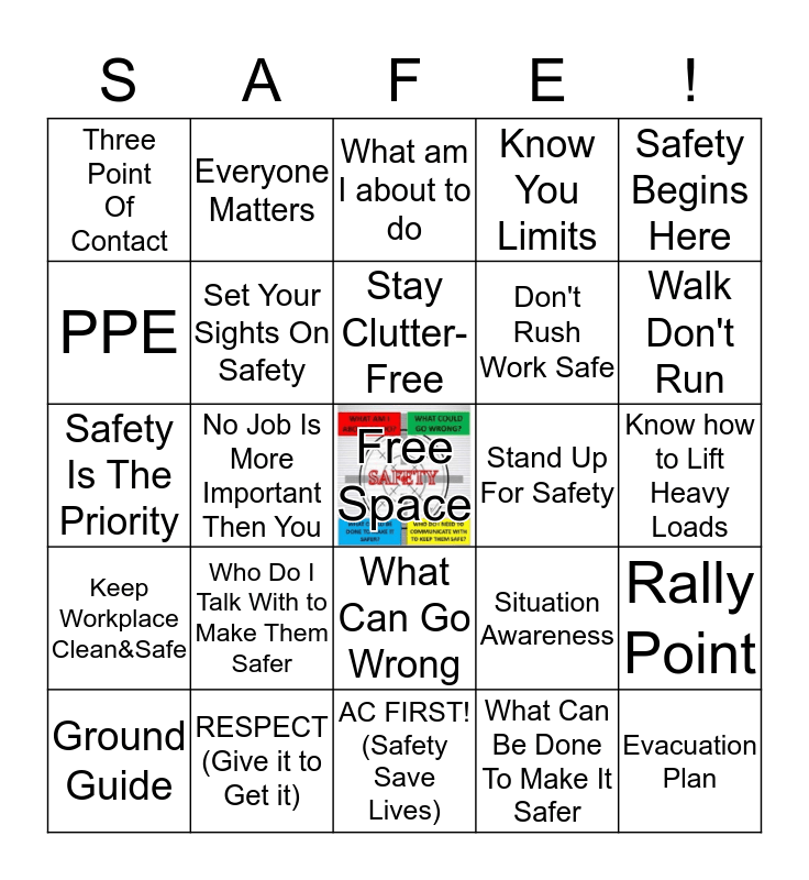 This bingo card has a free space and 24 words: Who Do I Talk With to Make Them Safer, RESPECT (Give it to Get it), Stay Clutter-Free, Ground Guide, Safety Begins Here, Three Point Of Contact, PPE, Everyone Matters, Stand Up For Safety, What Can Go Wrong, Don't Rush Work Safe, Safety Is The Priority, Situation Awareness, Rally Point, Set Your Sights On Safety, What Can Be Done To Make It Safer, Know how to Lift Heavy Loads, What am I about to do, Walk Don't Run, No Job Is More Important Then You, Evacuation Plan, Keep Workplace Clean&Safe, Know You Limits and AC FIRST! (Safety Save Lives).