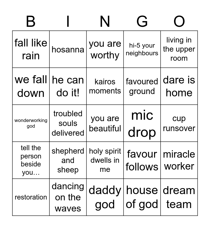 This bingo card has 26 words: holy spirit dwells in me, house of god, kairos moments, dancing on the waves, living in the upper room, fall like rain, we fall down, hosanna, cup runsover, favour follows, favoured ground, wonderworking god, miracle worker, restoration, troubled souls delivered, owala club, hi-5 your neighbours, tell the person beside you…, you are worthy, you are beautiful, dare is home, daddy god, mic drop, shepherd and sheep, he can do it! and dream team.