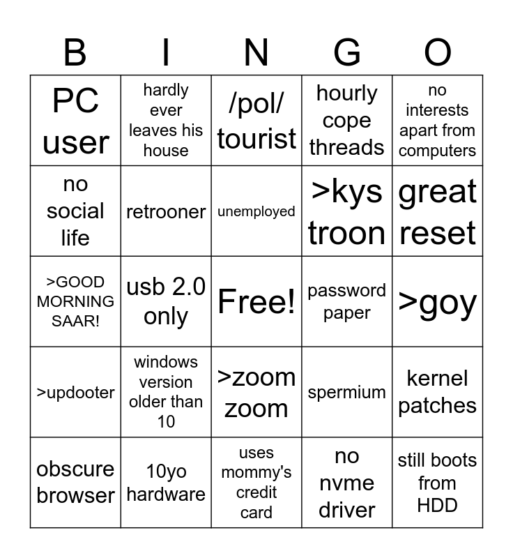 This bingo card has a free space and 24 words: windows version older than 10, 10yo hardware, unemployed, obscure browser, no interests apart from computers, PC user, no social life, hardly ever leaves his house, password paper, >zoom zoom, >kys troon, >GOOD MORNING SAAR!, spermium, kernel patches, retrooner, no nvme driver, >goy, /pol/ tourist, great reset, usb 2.0 only, still boots from HDD, >updooter, hourly cope threads and uses mommy's credit card.