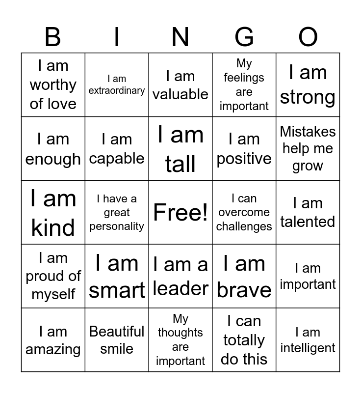 This bingo card has a free space and 24 words: I am smart, Beautiful smile, I am tall, I am amazing, I am strong, I am worthy of love, I am enough, I am extraordinary, I can overcome challenges, I am a leader, I am positive, I am kind, I am brave, I am important, I am capable, I can totally do this, I am talented, I am valuable, Mistakes help me grow, I have a great personality, I am intelligent, I am proud of myself, My feelings are important and My thoughts are important.